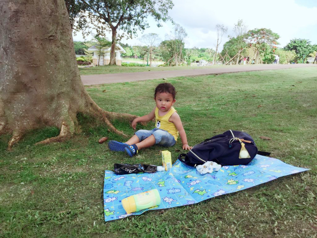 我們母子倆在樹蔭下野餐。