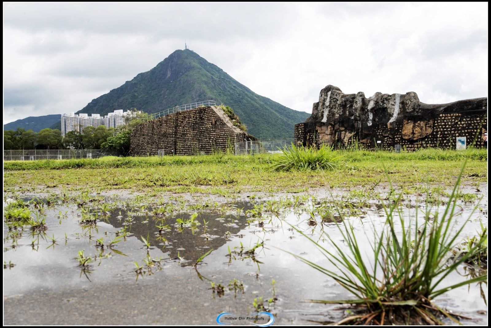 沈雲山上的觀塘上配水庫花園,一片綠色草坪,不失成為邨民一個美麗休憩地方。高山便是飛鵝山。