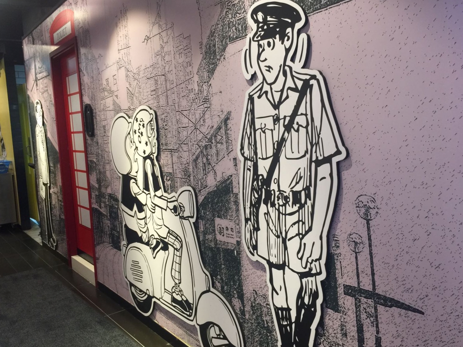 走進往洗手間的通道,兩邊牆壁上都有連貫的圖畫