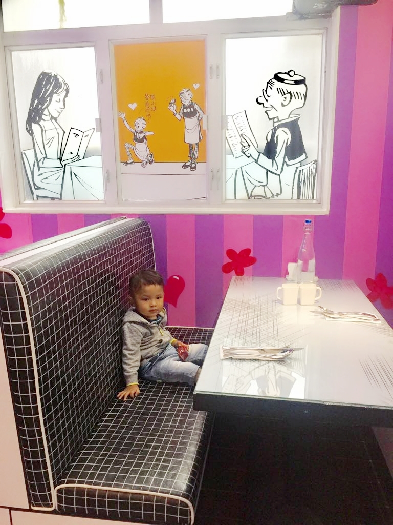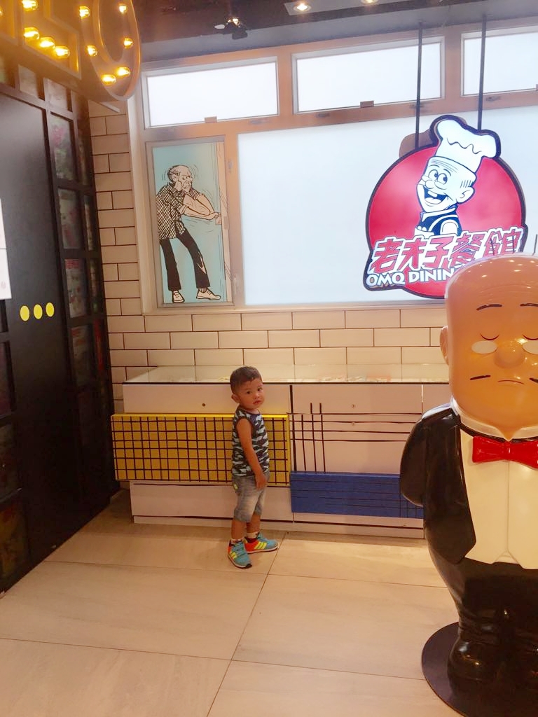 老夫子餐廳在剛開幕時我已經很想去,據說超爆滿都要等2小時,因為帶著小猪排隊等座位是非常不便!最後等到熱潮稍退了一點,加上今天在下大雨和過了午市人潮,心裡想著應該不用等太久吧?但幸好坐位還未滿!