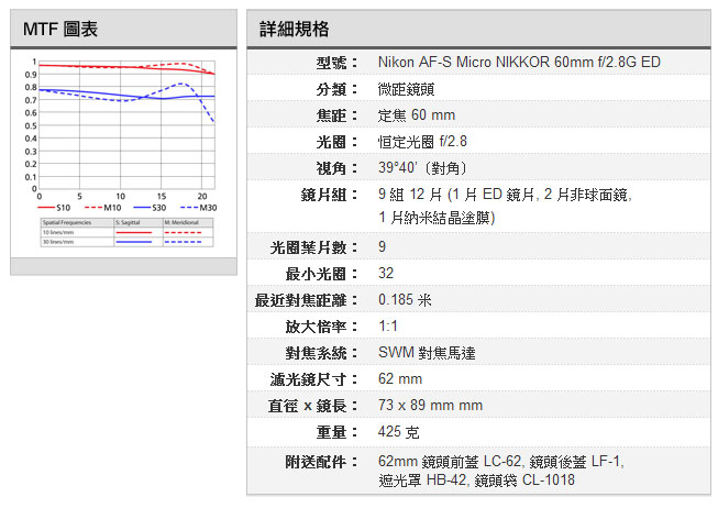 標準微距鏡的用處,最常見莫過於商品攝影,例如體積細小的珠寶首飾,又或收藏家要拍攝錢幣或郵票等。而AF-S Micro NIKKOR 60mm f/2.8G ED 在最近對焦距離下,可拍出 1:1 的放大率,最適合盡量利用感光元件的面積以紀錄物件的細節。其光圈值可於 f/2.8-32 之間調校,以一支標準鏡焦段的鏡頭來說,在景深控制上有相當充裕的空間,特別近攝時需要焦點與背景同時保持清晰的情況下,廣闊範圍的光圈調校實在非常有用。鏡組設計方面,新一代版本明顯加強,多達 9 組 12 片,當中包括兩片非球面鏡,幫助修正影像的邊緣像差,另有一片 ED 超低色散鏡片增強影像的清晰度。其中一片鏡片鍍有鈉米鍍膜,增強抗眩光的能力。對焦系統採用了 SWM 寧靜波動馬達及內對焦設計,對焦更快更靜之餘,還可以減少入塵機會。