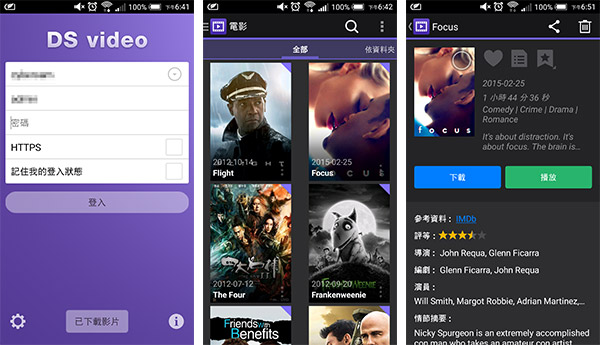 其實 Synology 針對手機、平板電腦,推出了幾個 apps,其中 DS video (Android / iOS 都有) 跟 Video Station 可謂完美銜接。在 DS video 中,利用之前註冊的 QuickConnect ID、登入名稱和密碼,便可以存取在 NAS 的電影。當然,少不了漂亮的 poster 和電影資訊啦!既然有 Android 版本,同樣地在一些運行 Android 的 TV Box (例如小米盒子) 上安裝這個 app,便可以在電視螢幕上看戲,更佳的視覺享受。
