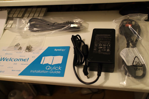 打開包裝,隨機配件有火牛、安裝硬碟用的螺絲、網絡線、及一張安裝指南。