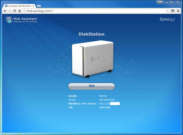 跟據安裝指南,在網址輸入 “find.synology.com” 便會尋找網絡內的 Synology DiskStation。