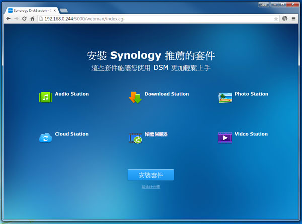 完成安裝及相關設定後,會轉到安裝套件頁面。可以立即安裝全部套件,或稍後按需要於套件中心內安裝個別套件。而這些套件都是相當實用的,建議全部安裝。