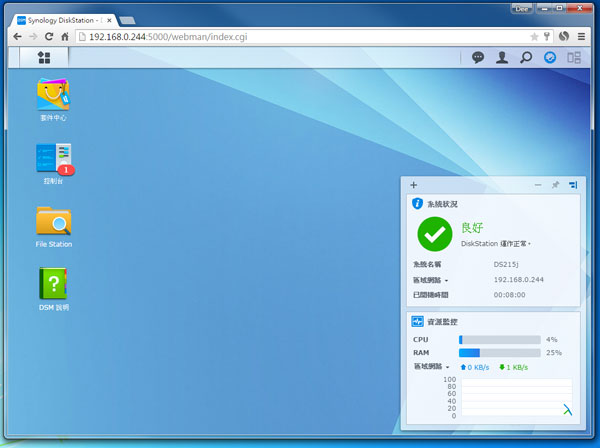 套件安裝完畢後便會轉到主畫面,Synology DiskStation 設定基本完成!