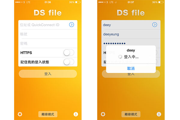 除了 File Station,流動裝置亦可透過 DS file App 連接 DiskStation,位置可輸入 IP 網址、DDNS 網址、或直接輸入 QuickConnect ID (先前已設定為 deey)