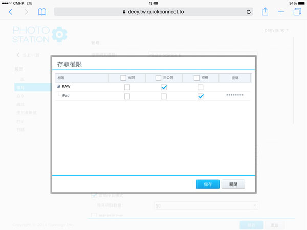 Photo Station 可以為個別相簿設定存取權限,可設定為公開、非公開或需要輸入密碼才能打開相簿。
