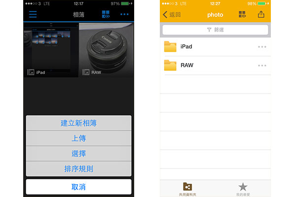 DS photo 能夠直接預覽 RAW 格式相片,DS file 則只能預覽 JPG PNG 等格式且預覽圖片較細小。同時亦支援圖片上傳及建立新相簿,