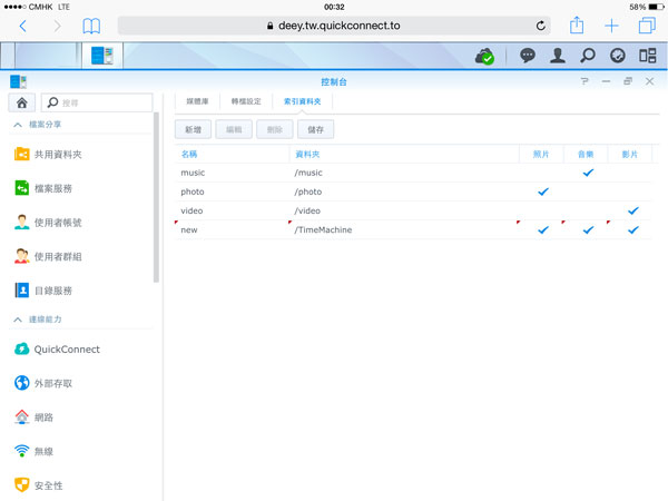 開始使用 DiskStation,首要先新增共用資料夾,可於控制台內的共用資料夾選項內設定。 (安裝套件時會預先設定部份共用資料夾,例如 photo、video 等)