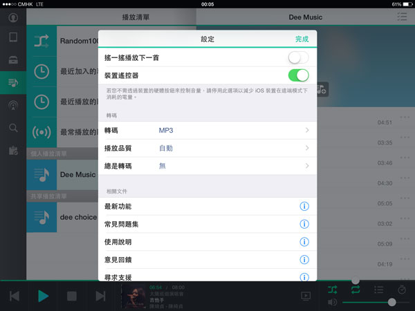DS audio app 設有轉碼選項,能將較大的音樂檔案轉碼以節省數據用量,就算是限速數據計劃(實際網速約為 500kbps) 都可以暢順地播放 Apple Lossless 等大容量格式檔案。