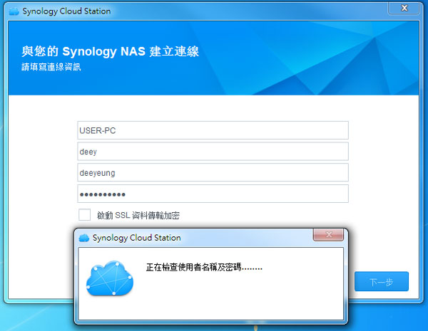 安裝妥當後打開 Cloud Station 輸入 QuickConnect ID (或 IP 位置)、用戶名稱、密碼,Cloud Station 會檢查連線是否成功。
