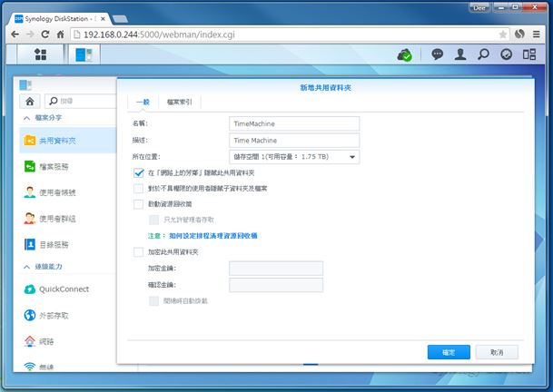 首先,於 DiskStation 指定一個資料夾作 Time Machine 之用。