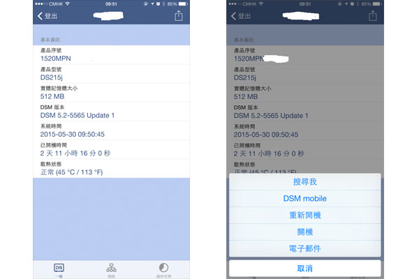 利用 QuickConnect 功能直接在街上連到家上的 DS215j,DS finder 能直接在外監察 NAS 的狀況,而且可以直接連到 DSM mobile,使用手機瀏覽器便可直接管理 NAS。
