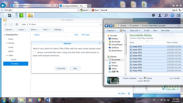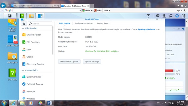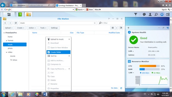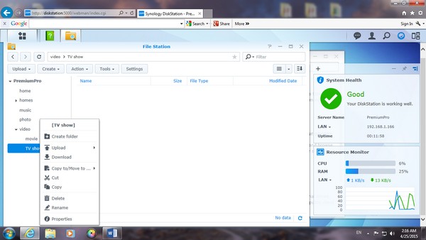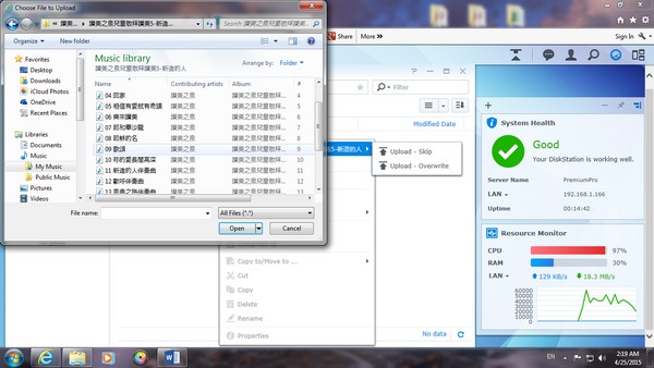 基本的 upload,download 也十分容易,如果以網頁版登入 NAS,只須把檔案直接拖拉到網頁上便能做到 upload。而以 Windows 7進行,只須於 NAS 內啟動 Windows 檔案服務,就能將 NAS 視為一個電腦內的硬碟一般進行儲存及移動檔案。
