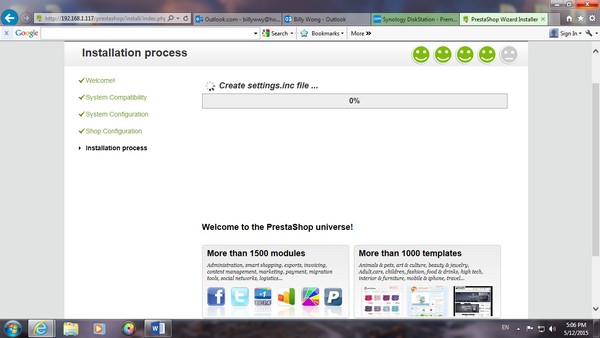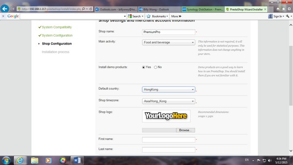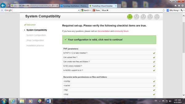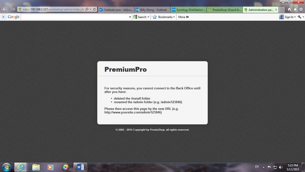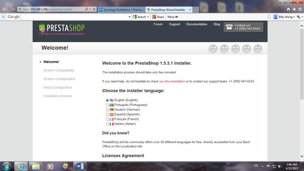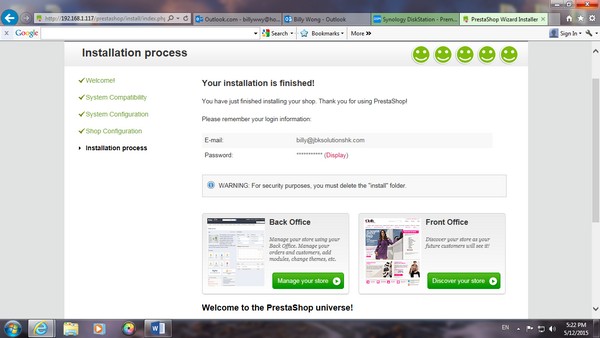 跟手回到 File Station 中,Web Folder 內,Delete PrestaShop 的 install file,及改了 admin folder 的名字,再到 PrestaShop,他會 direct 去到以下版面。由於設置 online Store 關係,delete 以上的folder 除了是必然程序,亦是為了保安的原因。
