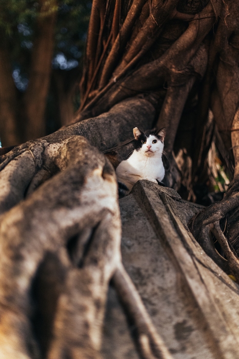 極低光環境下,小編以大光圈搭配較慢的快門,成功捕捉貓咪於樹根旁歇息的畫面