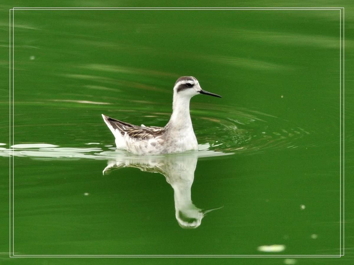 紅頸瓣蹼鷸 (Red-Necked Phalarope)全身體長約19公分,為普遍種冬候鳥。它的嘴喙既細又直,兩腳的趾間有瓣膜,眼睛有明顯的過眼黑斑,背部灰黑色,腹部白色。常成群在濕地、沼澤、鹽田、池塘、海灘地等地區覓取昆蟲或軟體動物為食。 旨在分享、多謝點擊