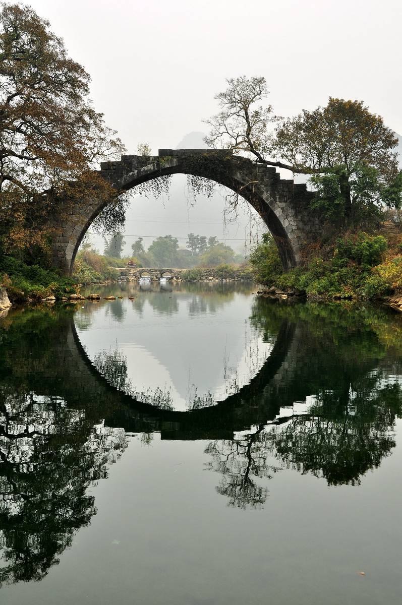 富春橋位於陽朔遇龍河的上游, 是我見過最美最圓的石拱橋.