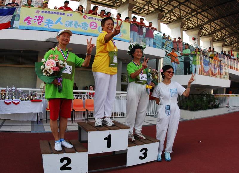 老人運勤会的優秀運動員,站在獎台上的一刻