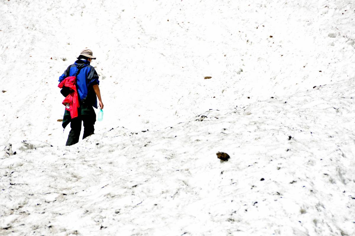 在一個雪山上,一個孤獨的旅者,在向著他的目標努力進發。