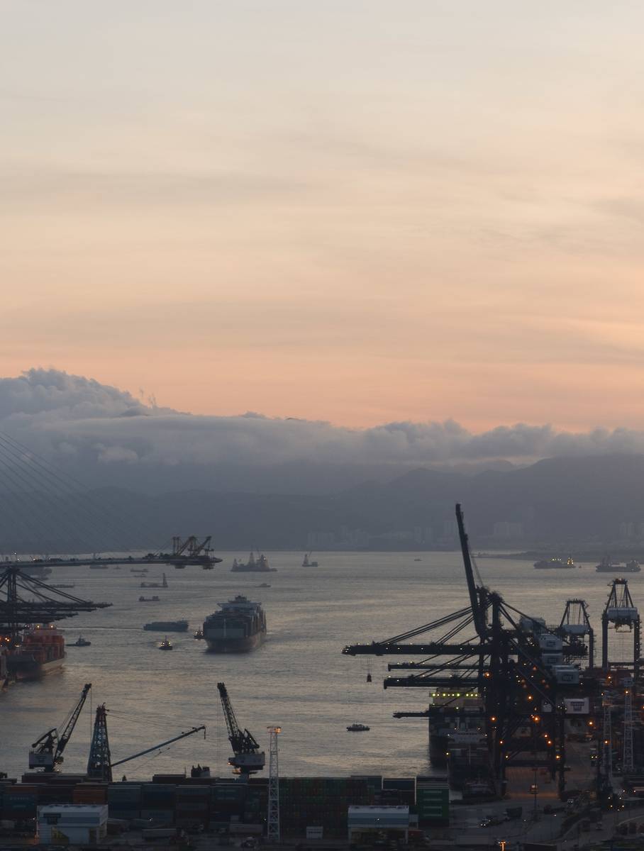 黃昏將至, 碼頭的貨船趕著離開, 向目的地進法