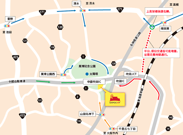 請由名神高速公路、近畿自動車道的吹田IC,或中國自動車道的中國吹田IC下。